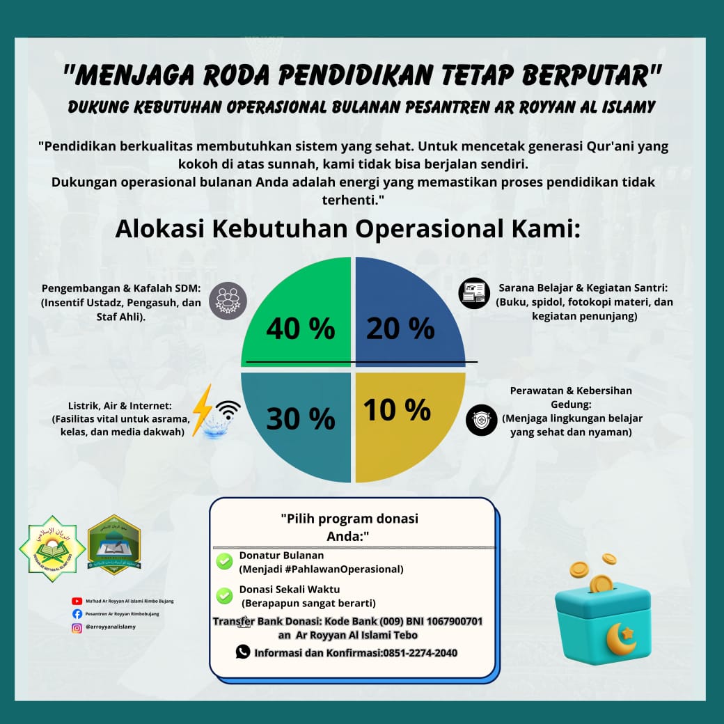 Pendidikan berkualitas membutuhkan sistem yang sehat. Untuk mencetak generasi Qur'ani yang kokoh di atas sunnah, Pesantren Ar Royyan Al Islamy tidak bisa berjalan sendiri. Dukungan Anda adalah energi utama yang memastikan proses pendidikan ini tidak terhenti.