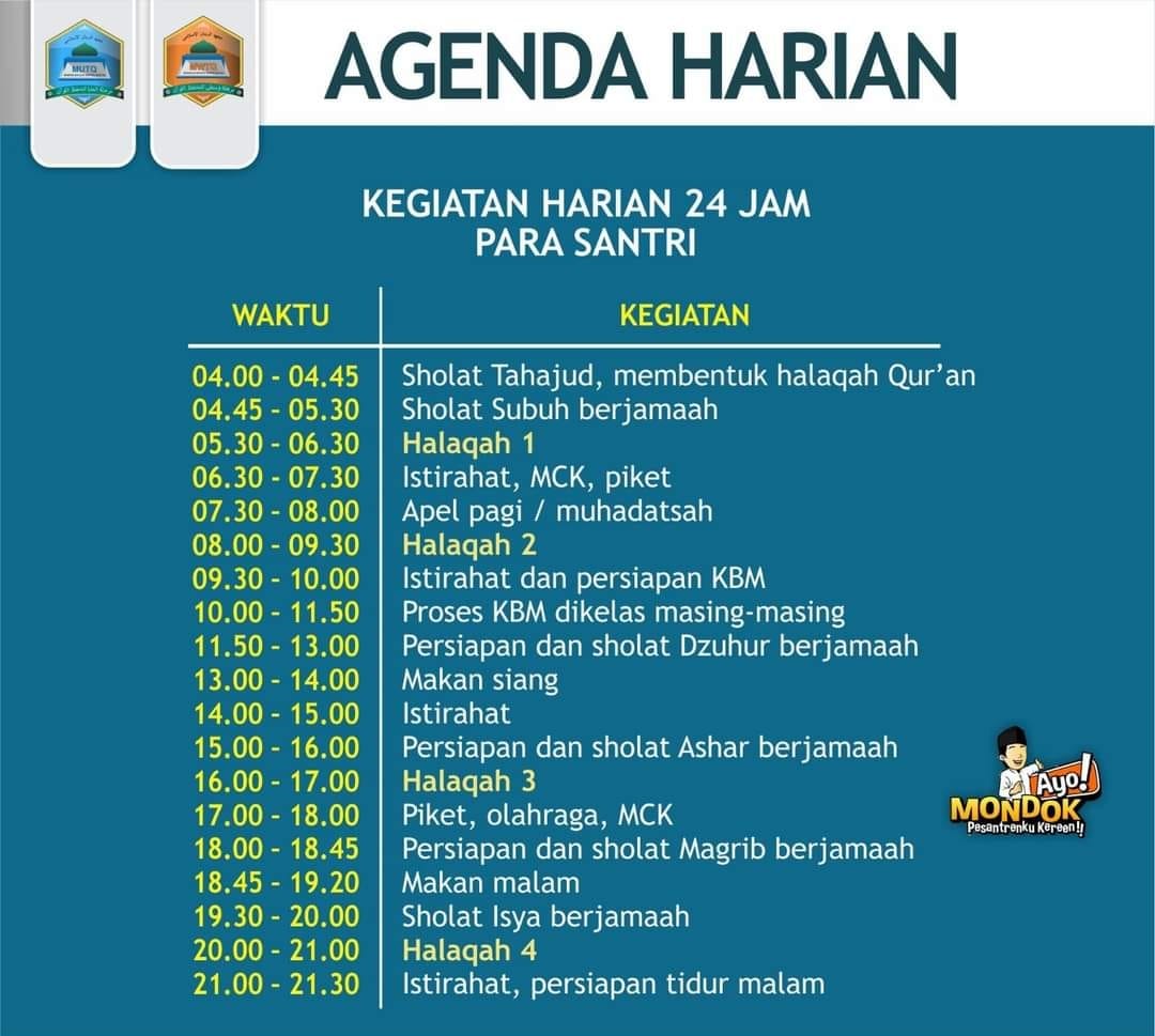 Demikian informasi mengenai agenda harian ini kami sampaikan. Jadwal ini dapat berubah sewaktu-waktu menyesuaikan dengan situasi, kondisi, atau program khusus pesantren.